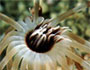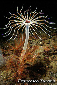A sinistra: particolare della corona di tentacoli striati di questo raro cerianto notturno, così come si presenta quando l’animale è attivo per la cattura del cibo.
