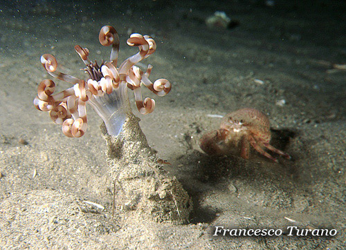 Sono passati molti anni da quando scovai per la prima volta uno dei celenterati ancora oggi meno conosciuti del nostro mare. Era il giugno del 1989 e sin da allora mi immergevo nelle acque antistanti il lido di Reggio Calabria, la città dove vivo. Avevo cominciato a frequentare i fondi mobili, quelli cioè con prevalenza di sedimento fine (sabbia, fango o detrito), e mi piaceva l’idea di fotografare e studiare gli animali dalle abitudini notturne. I fondali dello stretto sono subito scoscesi e con pochi colpi di pinne ti ritrovi subito tra i 30 e i 40 metri di profondità, dove il mondo sommerso svela i suoi segreti a coloro che sano apprezzare. E io ho subito apprezzato l’opportunità che la città dello stretto mi ha offerto, immergendomi di continuo dopo il calar del sole.
