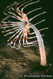 Sono passati molti anni da quando scovai per la prima volta uno dei celenterati ancora oggi meno conosciuti del nostro mare. Era il giugno del 1989 e sin da allora mi immergevo nelle acque antistanti il lido di Reggio Calabria, la città dove vivo. Avevo cominciato a frequentare i fondi mobili, quelli cioè con prevalenza di sedimento fine (sabbia, fango o detrito), e mi piaceva l’idea di fotografare e studiare gli animali dalle abitudini notturne. I fondali dello stretto sono subito scoscesi e con pochi colpi di pinne ti ritrovi subito tra i 30 e i 40 metri di profondità, dove il mondo sommerso svela i suoi segreti a coloro che sano apprezzare. E io ho subito apprezzato l’opportunità che la città dello stretto mi ha offerto, immergendomi di continuo dopo il calar del sole.