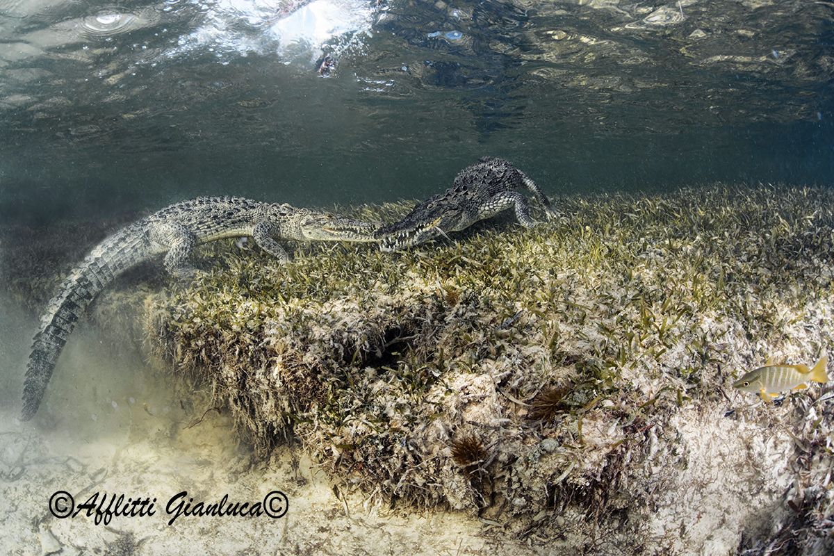 Ad Agosto, quando e’ stagione di aragoste, i coccodrilli americani, che vivono in mare nella grande laguna al largo della costa fra il Messico ed il Belize, arrivano famelici per banchettare con gli scarti della pesca.