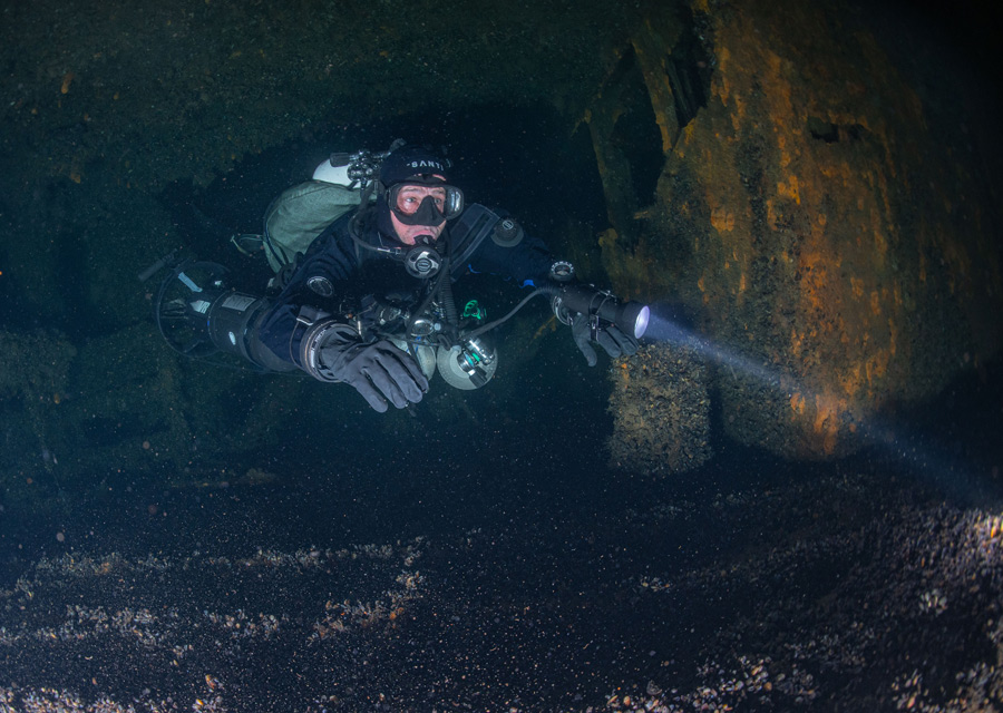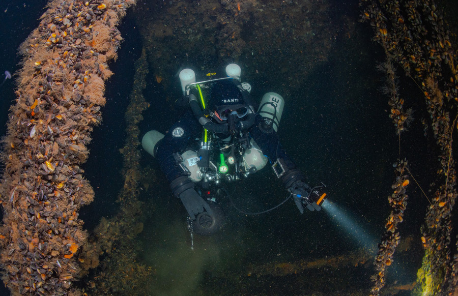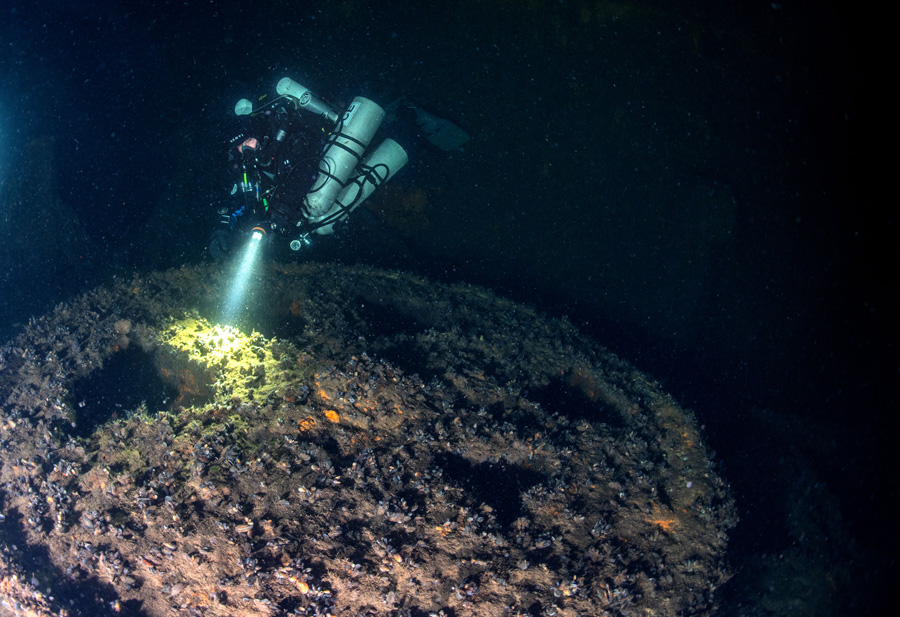 Giunti sul relitto cambiamo i setpoint dei CCR impostandoli a 1.3 di PPO2 e partiamo per l’esplorazione. Il potente faro portato da Tomasz ci consente di avere una visione molto più ampia di tutto il relitto e di orientarci meglio, rispetto al giorno precedente, durante la navigazione sul relitto. Tomasz ci guida seguendo la murata di dritta, che imponente si staglia per una lunghezza di circa 100 metri fino a raggiungere la poppa della nave rimasta integra.