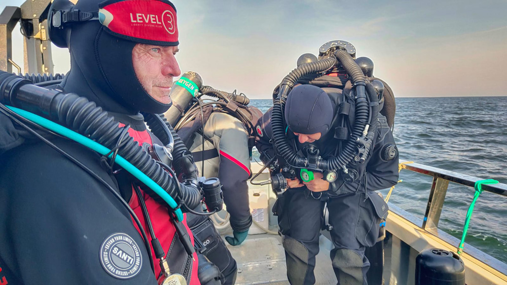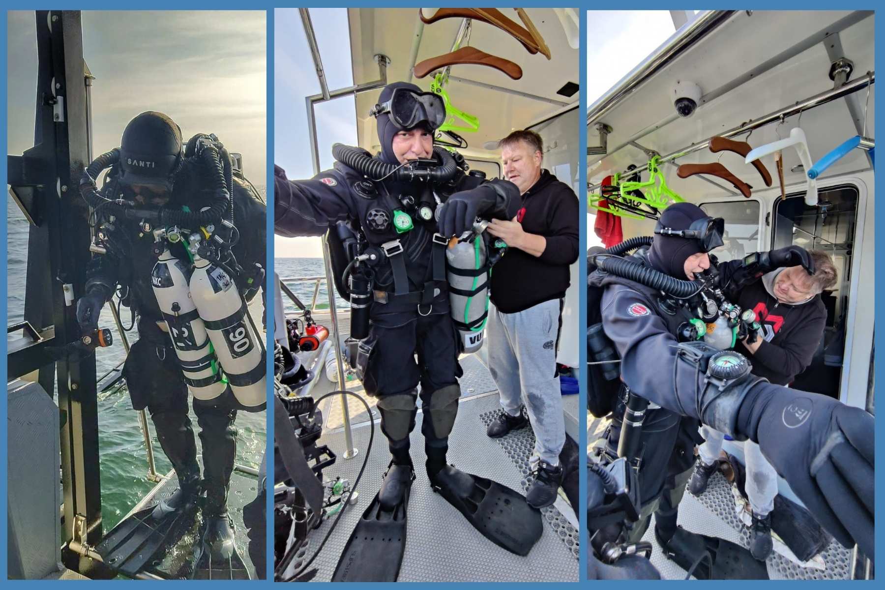 Dalle immagini studiate la sera precedente risulta evidente come il relitto sia in più punti ricoperto da lenze e grosse reti. Dedichiamo perciò una scrupolosa attenzione nel posizionare ulteriori strumenti da taglio, in modo da essere ridondanti in caso di intervento. Utilissimi durante queste immersioni, i sistemi riscaldanti Santi Heating System, in particolare i giubbotti corpetti riscaldati e i sottomuta BZ400 e Flex 2.0 completamente riscaldati. «La temperatura dell’acqua sul fondo – ci segnala Tomasz – in questo periodo, è pari a 4 gradi», tuttavia le condizioni climatiche esterne sono buone, sereno e soleggiato.
