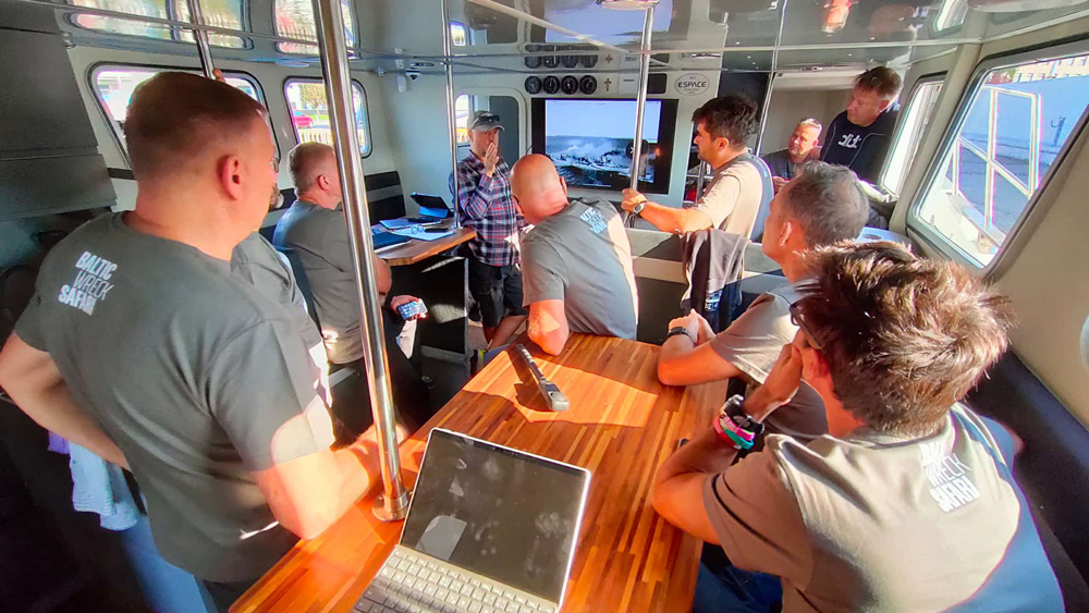 Prima giornata di immersione con meteo favorevole. Adatta per dirigersi sul punto d’immersione del relitto del Motor Tanken Franken a quindici miglia dalla nostra posizione. Dopo aver lasciato il molo, tutto il team trascorre le due ore che ci separano dal luogo dell’immersione per analizzare le miscele, configurare le attrezzature e discutere le procedure di sicurezza.
