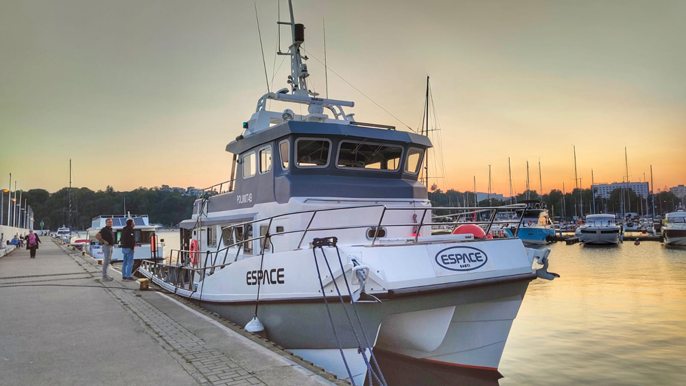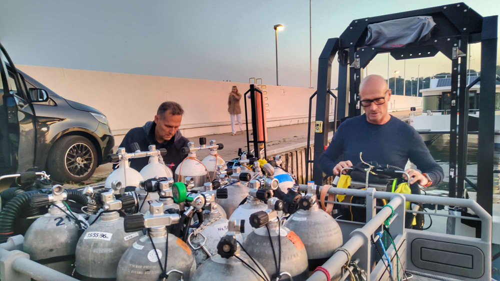 Partiamo da Verona con furgoni e auto alla volta di Gdynia in Polonia; dopo una sosta in Germania e oltre 1600 km percorsi arriviamo al porto turistico della cittadina situata nel Golfo di Danzica. Ad attenderci Tomasz Stachura, titolare dell’azienda Santi Diving, a bordo della M/Y Espace, un comodissimo e robusto catamarano del 2024, lungo quindici metri e largo cinque.