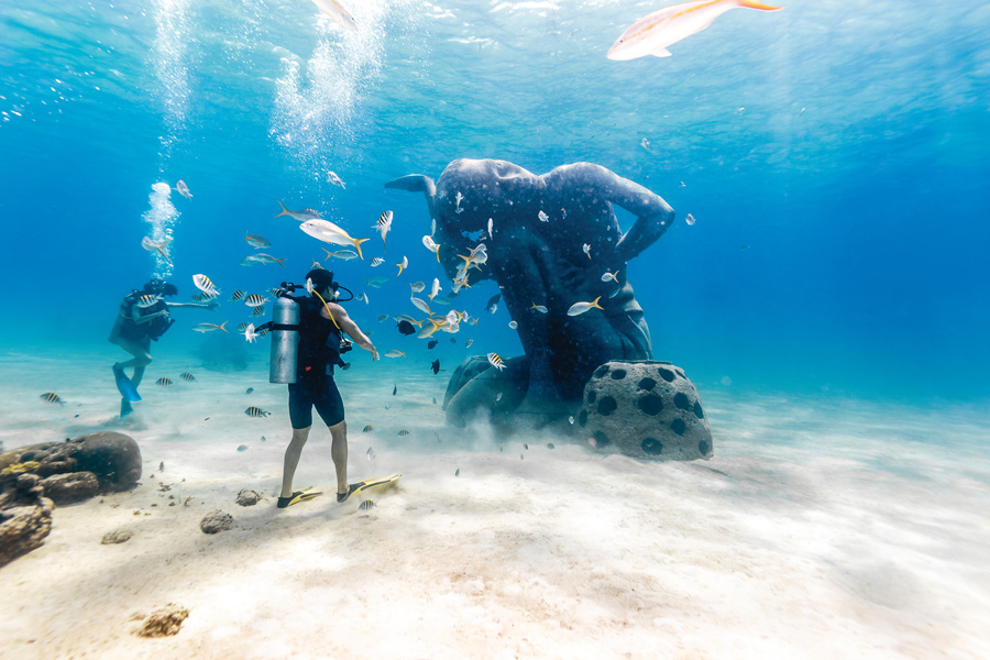 Qui ha sede uno degli istituti di ricerca sugli squali più influenti al mondo, la Bimini Biological Field Station (biminisharklab.com), che monitora e studia le varietà di squali presenti nell’area. Proprio a loro si deve la scoperta di un visitatore straordinario: il più grande rappresentante della famiglia delle teste a martello, lo Sphyrna mokarran. Questo predatore alfa, che può arrivare fino a 5 metri e mezzo di lunghezza, ha un’abitudine migratoria che lo porta a Bimini tra novembre e aprile di ogni anno. Uno squalo di queste dimensioni potrebbe essere considerato potenzialmente pericoloso, ma, adattando le tecniche di alimentazione diffuse a Nassau, gli operatori subacquei hanno scoperto di poterci interagire in sicurezza.