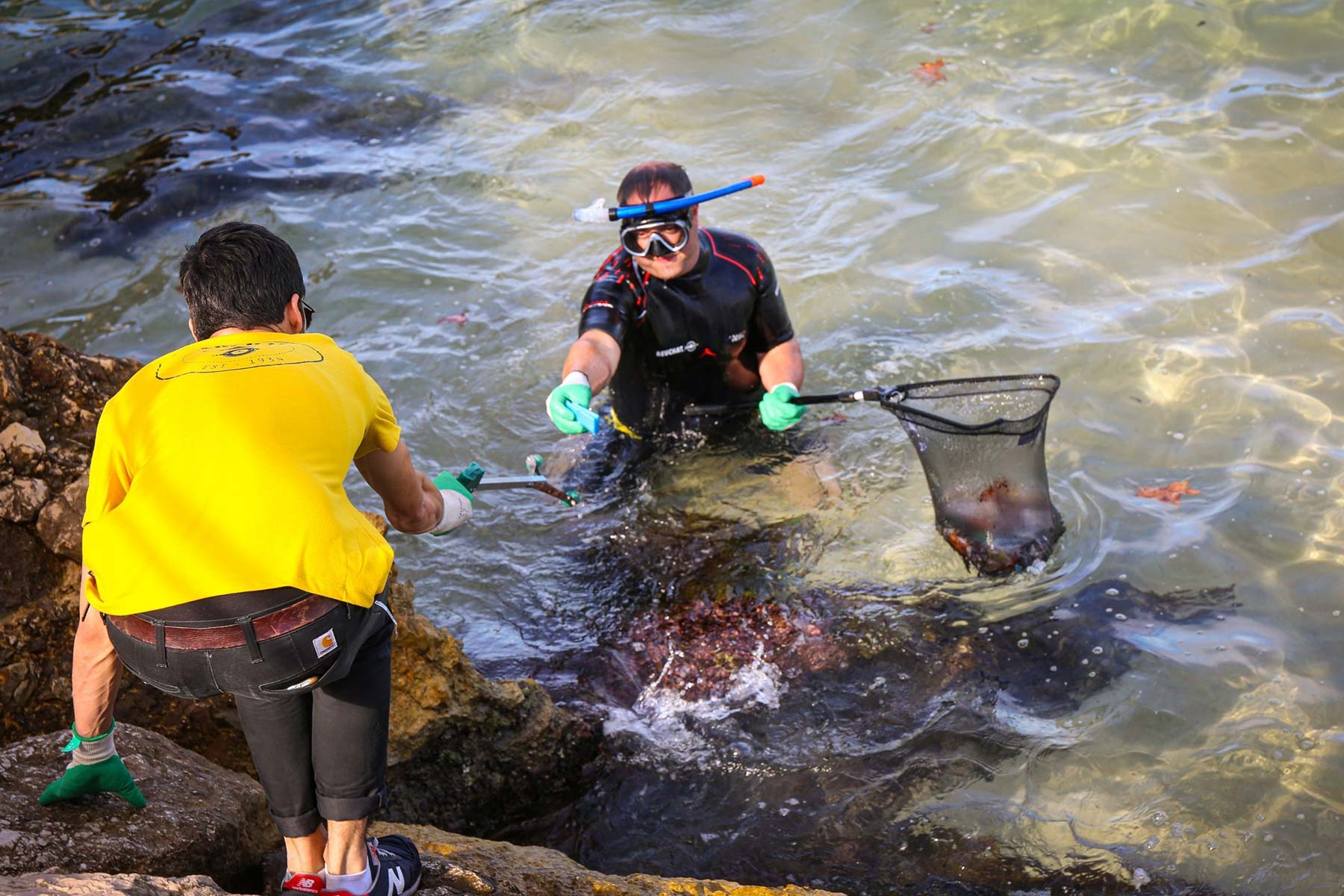 Un uomo in acqua consegna una rete piena di rifiuti a un altro uomo a riva