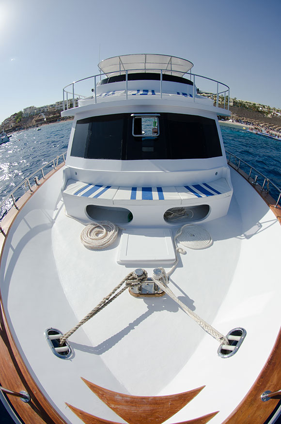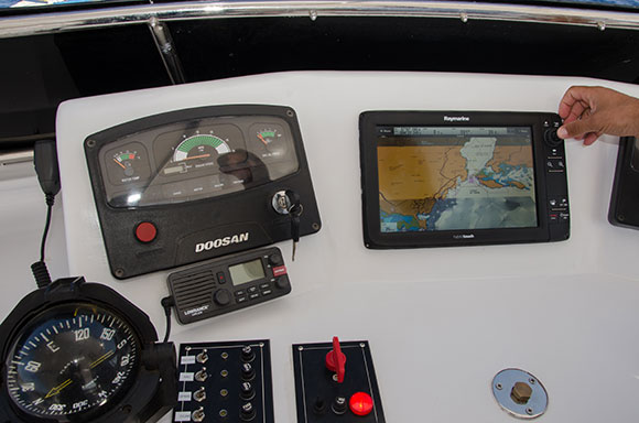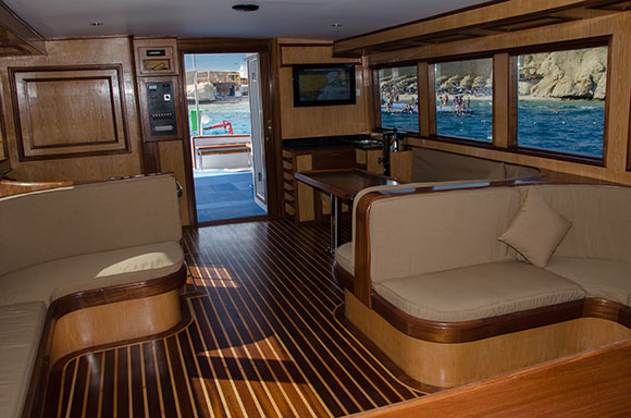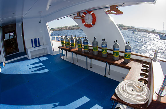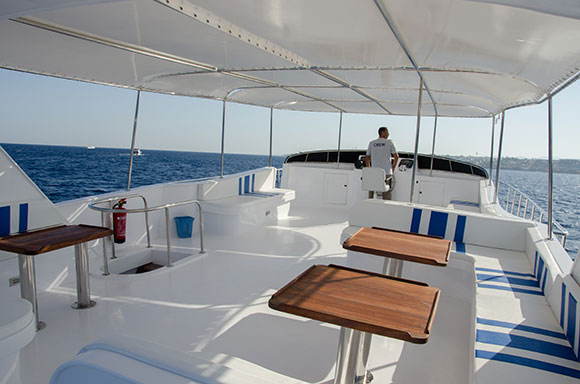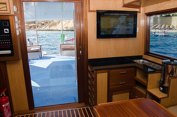 Navigatori satellitari di ultima generazione che indicano la posizione in tempo reale su uno schermo a disposizione di tutti; una videocamera che trasmette in diretta le immagini subacquee nella TV a schermo piatto da 32 pollici ubicata nel salone interno; ma soprattutto una videocamera posizionata nel ponte di poppa, che consentirà al comandante di monitorare l’ingresso in acqua dei sub e la risalita in barca. Un accorgimento ideale per le immersioni in corrente che a Sharm sono frequenti, garantito anche durante le uscite notturne grazie alla luce a infrarossi.