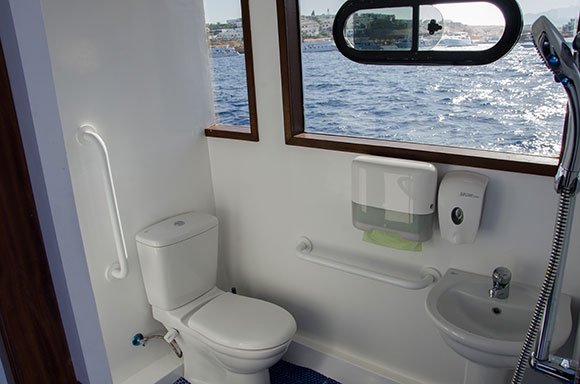 Quali sono le caratteristiche che faranno felici soprattutto i disabili? Unico a Sharm e probabilmente in tutto il Mar Rosso tra le barche daily, è senz’altro il braccio idraulico fissato alla piattaforma a poppa, che consentirà una semplice risalita ai sub con difficoltà di movimento. Il salone interno inoltre è sufficientemente ampio da garantire movimenti autonomi a chi si muove in sedia a rotelle, oltre che un accesso semplice al tavolo del buffet per il pranzo.