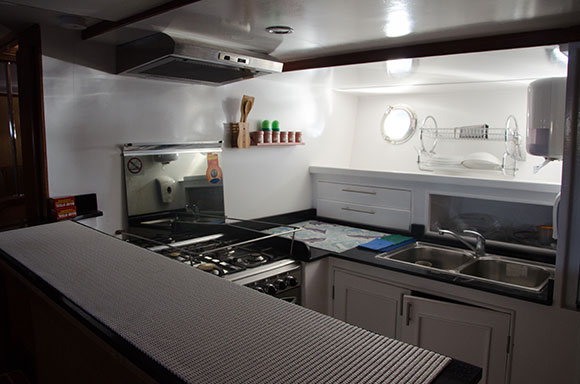 Oltre agli ampi spazi nei ponti e nel salone interno, Camel Tribe dispone anche di un altro spazio interno al livello della cucina. Le zone coperte sono efficientemente ventilate e i potenti aspiratori minimizzano gli odori, che spesso infastidiscono durante la navigazione, soprattutto con le altre temperature.