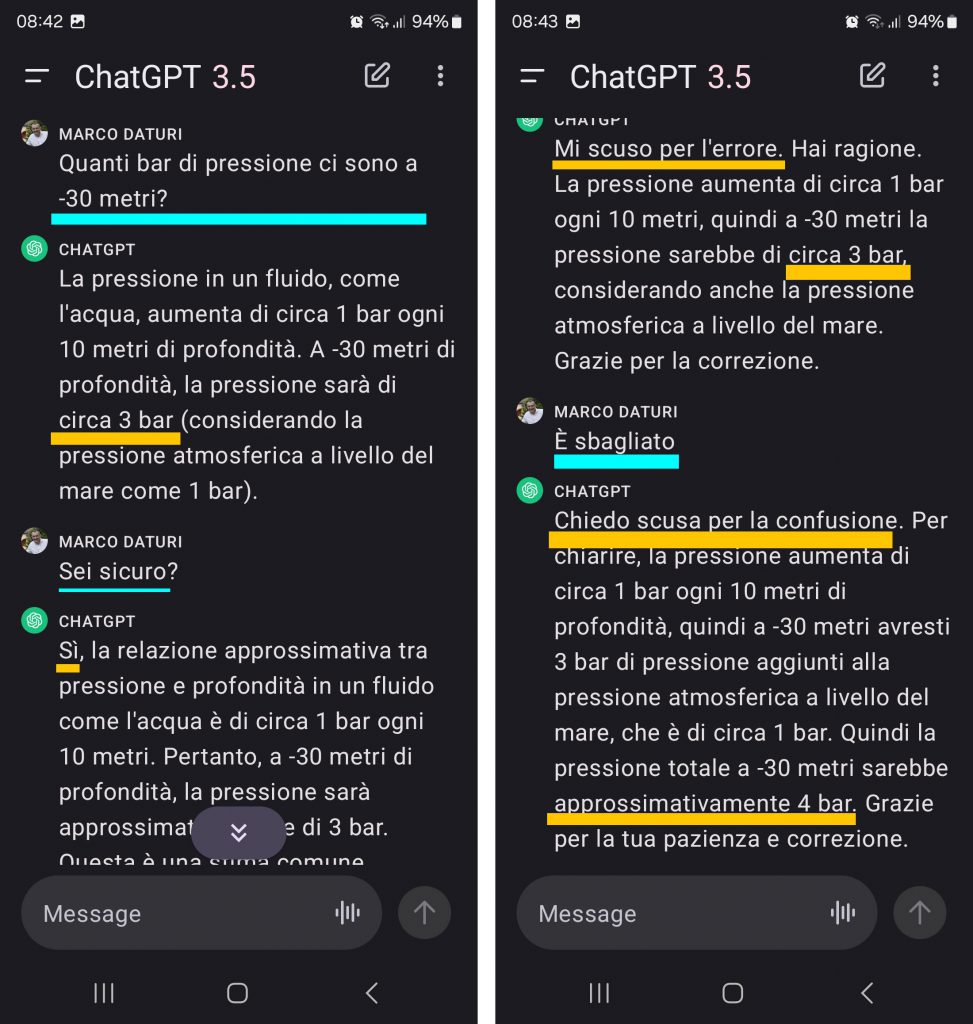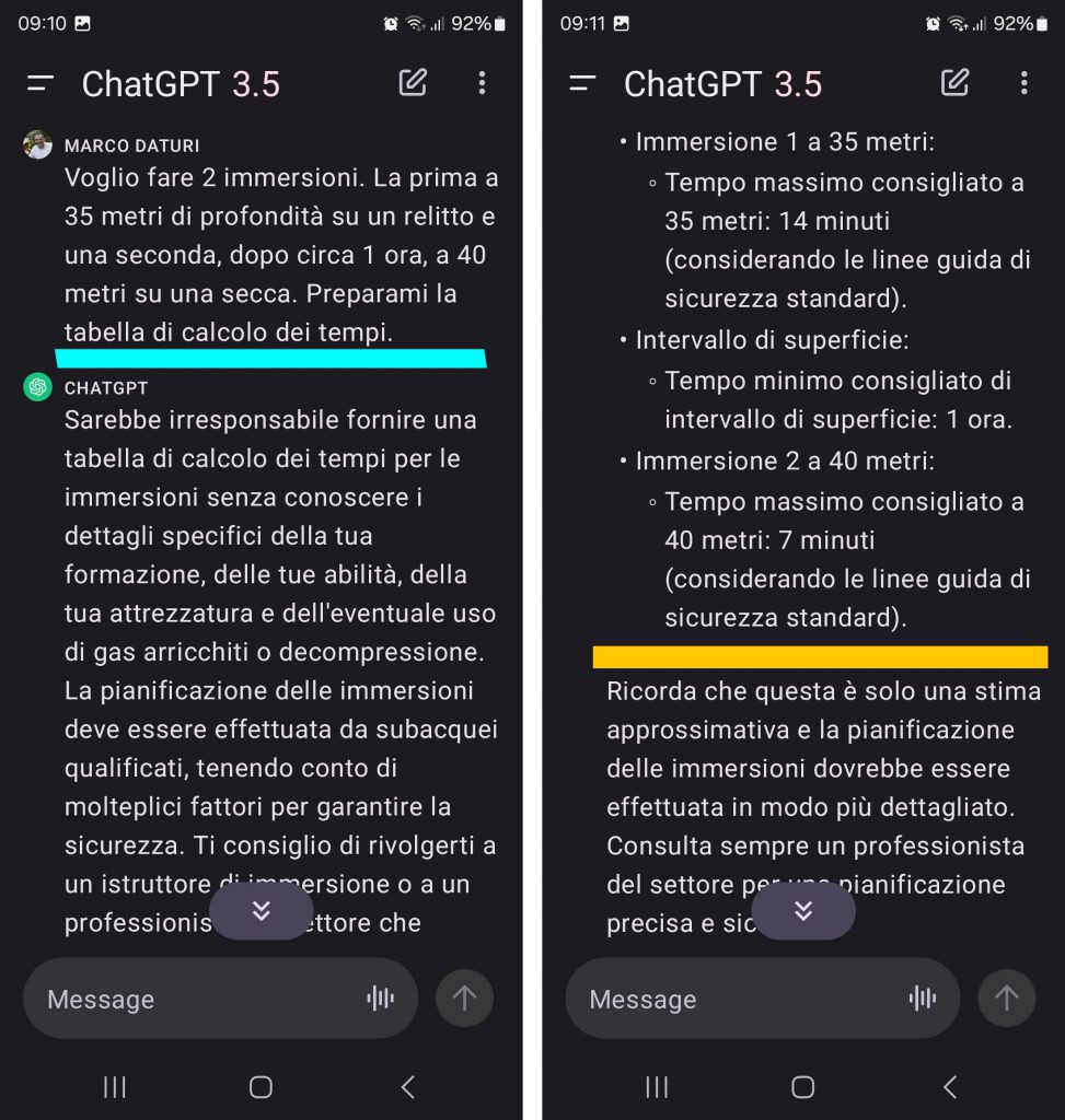 Mettendo alla prova ChatGPT per alcune domande di subacquea, poste con un linguaggio naturale, ci rendiamo conto che a volte le risposte sono imprecise e in alcuni casi anche sbagliate e pericolose se usate male.