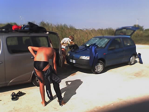 Sveglia di buon ora raggiungiamo la località di immersione intorno alle 8 di una domenica mattina agostana, quando tutto il popolo si riversa sulle spiagge accaldate dal sole del sud.