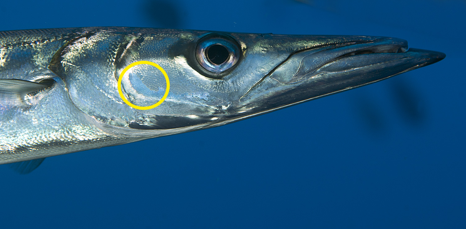 Sphyraena viridensis, la foto sotto evidenzia l’area priva di scaglie)