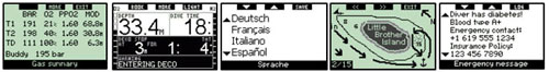 ? Allarmi testuali, multi lingua. Tutti gli avvisi e gli allarmi vengono visualizzati mediante chiari messaggi di testo nella lingua prescelta, non fraintenderai mai un allarme cruciale. Per esempio se stai risalendo troppo veloce, Galileo indicherà “RISALITA T. VELOCE” sul display. Gli allarmi di testo sono mostrati nella lingua scelta tra le 6 pre-configurate (Italiano, Francese, Inglese, Olandese, Spagnolo e Tedesco, molte altre lingue sono disponibile per il download dal nostro sito) insieme ad un avviso sonoro.