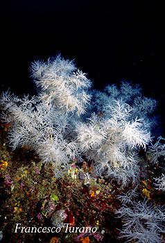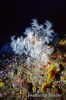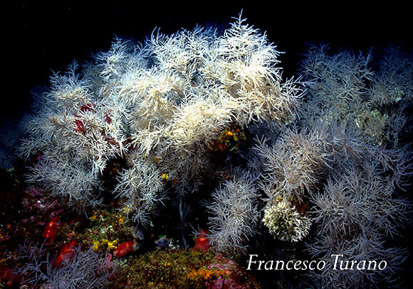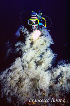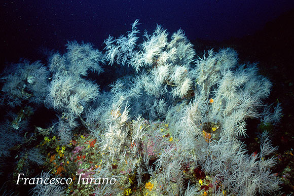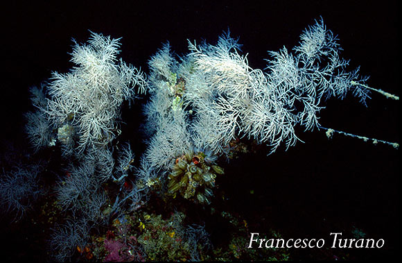 Nulla si è fatto per far conoscere e conservare la foresta di gorgonie mediterranee probabilmente più bella del mondo, nulla si è fatto per tutelare un ambiente incredibilmente ricco e vitale. Ma trovandomi a parlare di corallo nero e poiché sicuramente il lato positivo della faccenda è che in un modo o nell’altro viene alla luce una questione importante, ovvero la segnalazione delle meraviglie viventi nel mare dello Stretto di Messina, mi tuffo nell’argomento spiegando in poche parole di che animale stiamo parlando. Il nome comune del corallo nero è Antipatario del Mediterraneo mentre il nome scientifico, lo abbiamo già visto, è Antipathes subpinnata. Appartiene all’ordine degli Antipatari e i suoi polipi, cioè le unità viventi che formano poi nell’insieme una colonia, hanno 6 tentacoli corti, non pinnati, il che classifica questo celenterato come esacorallo. Sott’acqua, nel suo ambiente, si presenta con rami simili a folti ciuffi bianchi, con sfumature ceneree, fortemente ramificati. Si trova sempre sotto i 50/60 metri di profondità e l’incontro per il subacqueo è difficile e occasionale. Oggi la specie è considerata protetta, in funzione della sua delicatezza e della sua sensibilità ai mutamenti ambientali.