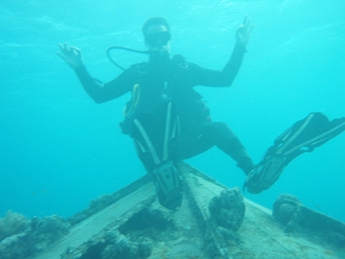 Alessio ci ha praticamente inculcato una nuova filosofia grazie alle sue perle di vita vissuta in romanesco; Cisco, palesemente rasta, ci ha regalato un mix di simpatia sarda e calore san salvadoriano e uno spettacolo mai visto grazie all’ effetto-medusa dei suoi dred liberi sott’acqua e per finire, Andrea (per gli amici Pozzi), sempre presentissimo video operatore, che ha immortalato i migliori momenti delle nostre immersioni e della vita sulla barca ed allo stesso tempo attento a ciascuno di noi al punto da accorrere in aiuto alla prima difficoltà e per questo soprannominato dal gruppo ‘sea angel’ . Ovviamente tutti abbiamo comprato il suo dvd, dolce compagno nei momenti di nostalgia che ti assalgono al ritorno, … ma anche efficace modo per suscitare l’invidia degli amici subacquei che sono rimasti a casa (soprattutto il pezzo degli squali martello ) . Volete un assaggio ?