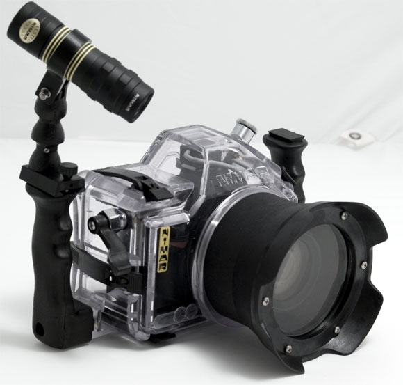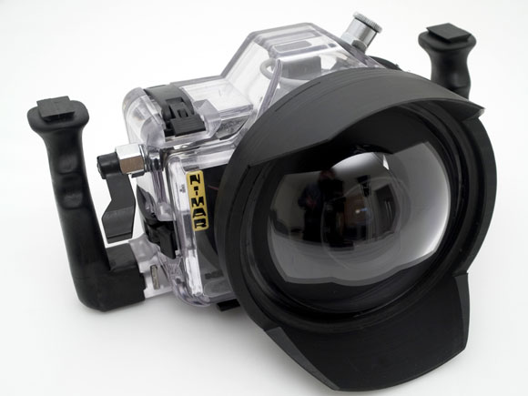 completa di impugnatura dx, sx., comandi esterni, scatto, possibilità di rivedere la foto scattata, cestinarla, (tutti i comandi indispensabili al corretto uso in acqua) uscita flash, oblò estraibile a baionetta di varie lunghezze, ganci di chiusura estremamente semplici e comodi .