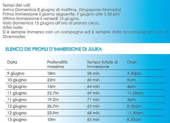 polmonare, che riguadagnerò poi con il passare del tempo, ma potrebbe anche permanere una qualche perdita residua. Non ho ripreso ad immergermi, in quanto vivo a Cape Town e ad essere onesta qui le acque sono troppo fredde per me! Inoltre, il DAN mi ha raccomandato, qualora volessi tornare ad immergermi, di sottopormi ad una visita medica completa per la subacquea, per valutare se sono idonea alle immersioni e se lo sono potrebbero anche decidere che potrei aver bisogno di una mia specifica tabella di immersione, che loro potrebbero calcolare apposta per me”. Julika è nota per aver affermato che l’ambiente sommerso “E’ la mia passione. Nell’acqua io trovo pace ed un senso di identità ed è un momento in cui mi sento perfettamente a mio agio”. Con una tale passione per le immersioni ed il mondo subacqueo, speriamo che Julika torni al mondo sommerso nell’immediato futuro.