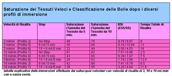 Concordemente all’ipotesi fatta, è stato rilevato che la presenza delle bolle è direttamente collegata con la sovrasaturazione critica dei tessuti più veloci, quelli cioè con tempi di emisaturazione che vanno dai 5 ai 20 minuti, piuttosto che di quella dei tessuti più lenti e che sono quindi proprio i tessuti più veloci quelli che si rivelano critici nella fase di risalita; più veloce è il tessuto (cioè 5 contro 10 minuti, 10 contro 20 minuti), maggiore il numero di bolle rilevate.