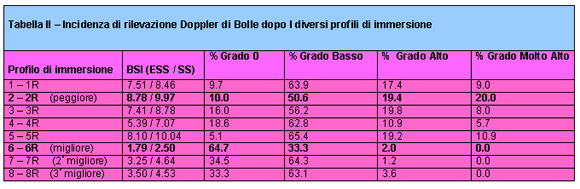 Sebbene sia le variazioni nella velocità di risalita che le soste di sicurezza provochino modifiche individuali nei gradi delle bolle rilevate nei subacquei, come chiaramente indicato nella tabella II, i punteggi più bassi sono stati ottenuti solo tramite l’aggiunta di una sosta profonda di 5 min. a 15 mt. (profilo 6).