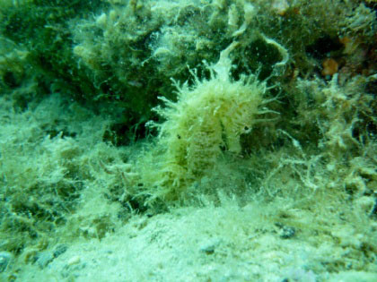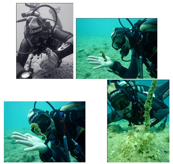 Finalmente mettiamo sulle spalle i nostri GAV montati sulle 10 litri (e mannaggia a me un chiletto in più potevo metterlo con il bombolino piccolo ma in un modo o nell’altro mi aggiusto) e dopo un breve tratto a piedi e la prima sensazione di refrigerio data dall’acqua che filtra nelle nostre mute, si scende giù.. ma non un giù giù.. un giù piccolino. Un giù di appena 4 metri e occhi aperti e piccole pinnate,che accompagnano il nostro lento respiro in quel pozzo di cristallo, noi tre amici ci troviamo davanti il primo, piccolo cavalluccio marino: una creatura che solo a guardarlo ti strizza il cuore riempiendolo di tenerezza e emozione.