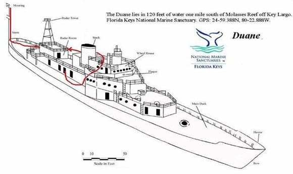 Verso le 9 am lasciamo Key Largo Harbor in direzione dell’Atlantico e il “Voyager” vola letteralmente sull’oceano a una trentina di nodi di velocità, in mezzo a onde alte circa un metro. In breve tempo raggiungiamo il nostro primo punto d’immersione: latitudine 24°59’38”N, longitudine 80°22’92”W, dove si trova il relitto dell’USCG “Duane”, un guardacoste lungo 100 metri che nel 1987 quando è stato radiato dal servizio è stato affondato per farne un reef artificiale.