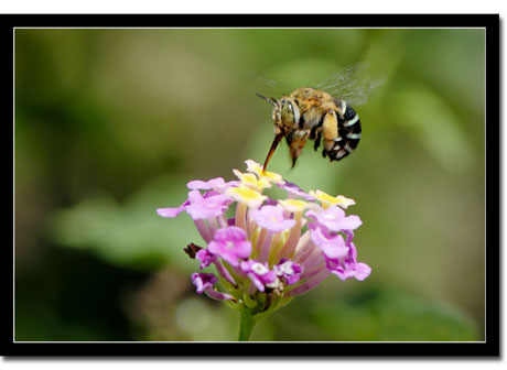 Un Imenottero preso in volo mentre con la piccola lingua succhia il nettare da un fiore.
