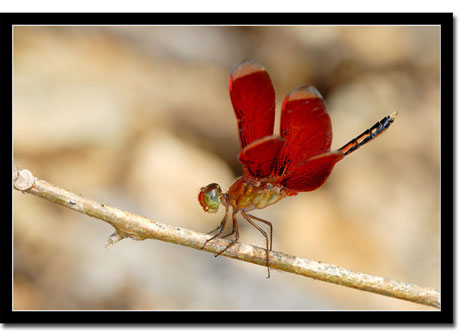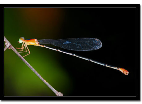 Queste minuscole ed esili libellule sono molto simili alle nostre Pyrroshoma nymphula. Variano unicamente in piccole modifiche della colorazione. Questa libellula aveva scelto l’interno della foresta come habitat.