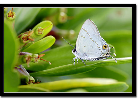 Queste minuscole farfalle erano molto comuni ed avevano sviluppato una interessantissima caratteristica. Le ali nella parte posteriore presentano delle appendici che ricordano delle antenne, muovendo le ali le appendici scattavano creando l’illusione estremamente efficace che la testa fosse li. Si nota anche il "falso occhio". Tutte piccole e molto veloci ne ho fotografate di più varietà con lievi variazioni nella colorazione.
