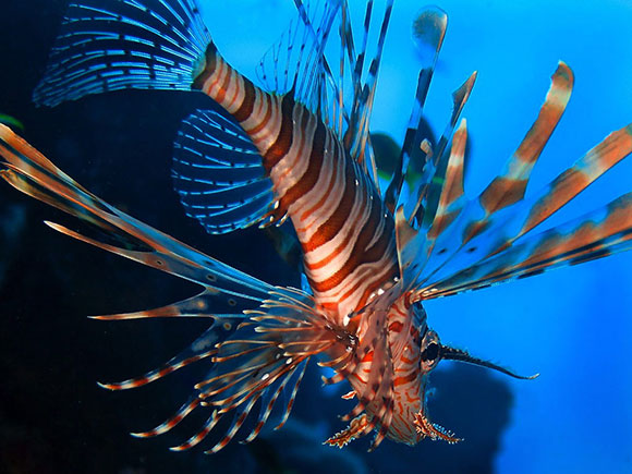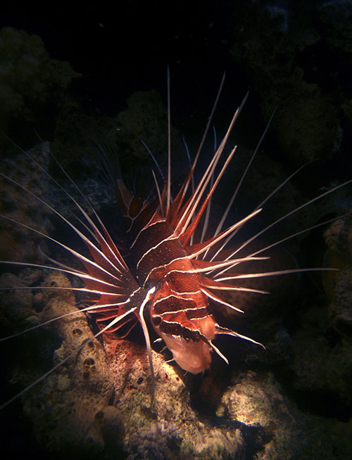 luci in faccia. I pesci scorpione di notte cacciano, potrebbero avvicinarsi alle