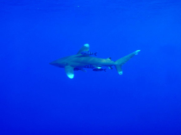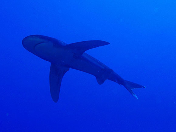 Carcharhinus longimanus, attraversa l’acqua rasente la chiglia, incurante di