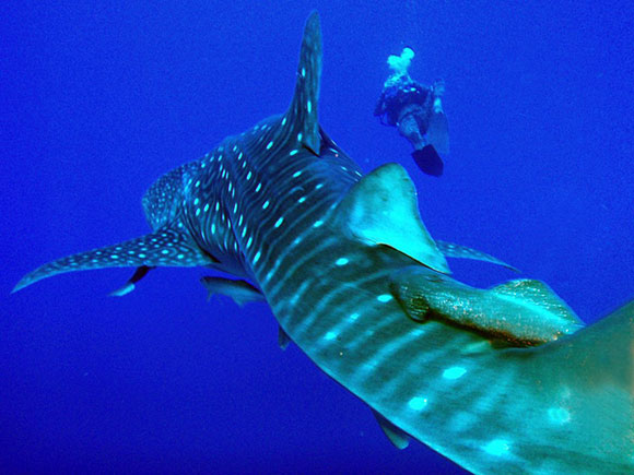 uno squalo balena di sette metri che avanza gentilmente nell’attonimento
