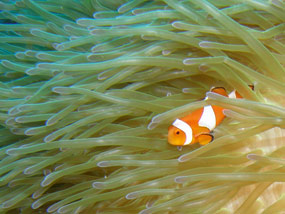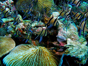 Tra gli anemoni che si incontrano durante l’immersione, come al solito colonizzati dai pesci pagliaccio, si vedono però anche e sempre, gamberetti, granchi ed anche quello che io considero il più bel pesce del mondo: il pesce cardinale di Banggai.
