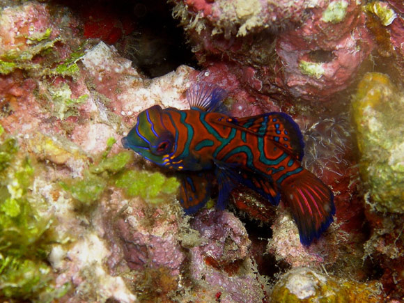 Infatti qui nascosti nel loro corallo che funge da rifugio diurno, i pesci mandarino non sono uno o due, come al solito, ma decine ed all’imbrunire, escono per farsi ammirare ed iniziare la loro danza dell’amore, che li porta ad innalzarsi sopra il corallo uniti in coppia, per poi ritornare improvvisamente e velocemente nel loro nascondiglio.