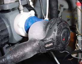 Foto di destra: Tipico assemblaggio del secondo stadio dell’erogatore Abyss 22 Navy, con congelamento esterno dopo l’esposizione della fase 2. L’erogatore viene mostrato al di sopra dell’acqua.”*
