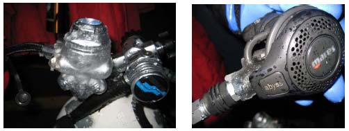 Foto di sinistra: “Tipico assemblaggio del primo stadio dell’erogatore Abyss 22 Navy, con esterno ghiacciato dopo l’esposizione della fase 2. L’erogatore viene mostrato al di sopra dell’acqua.”*