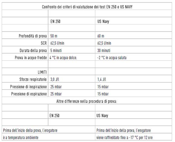 Ogni singolo dispositivo utilizzato da un subacqueo militare deve affrontare un processo di approvazione che, nel caso degli erogatori, include un test estremamente duro in acque fredde. Questi test vengono eseguiti dal Navy Experimental Diving Unit (NEDU), lo stesso che determina poi l’approvazione o il rifiuto di un’attrezzatura. La tabella di seguito mette a confronto i dettagli del test U.S. Navy dell’erogatore con quelli del molto meno rigoroso EN250. L’EN250 è la norma europea alla quale ogni erogatore deve attenersi per poter essere venduto in Europa. E’ immediatamente ovvio che ciò che va bene per un subacqueo sportivo è ben lontano da poter essere impiegato da un subacqueo militare!