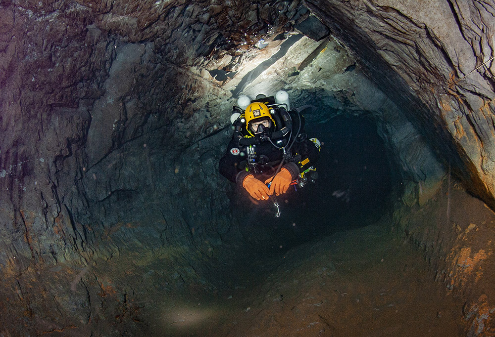 Ci dirigiamo verso il pozzo, facciamo i controlli necessari. Willem passa per primo attraverso il pozzo, che è abbastanza ripido fino ad una profondità di 30m. Poiché diversi subacquei sono già scesi in acqua prima di noi, la visibilità è molto scarsa qui e dobbiamo seguire la cima al tatto. A 12m e 20m di profondità posiamo le nostre bottiglie con i nostri gas per la deco.