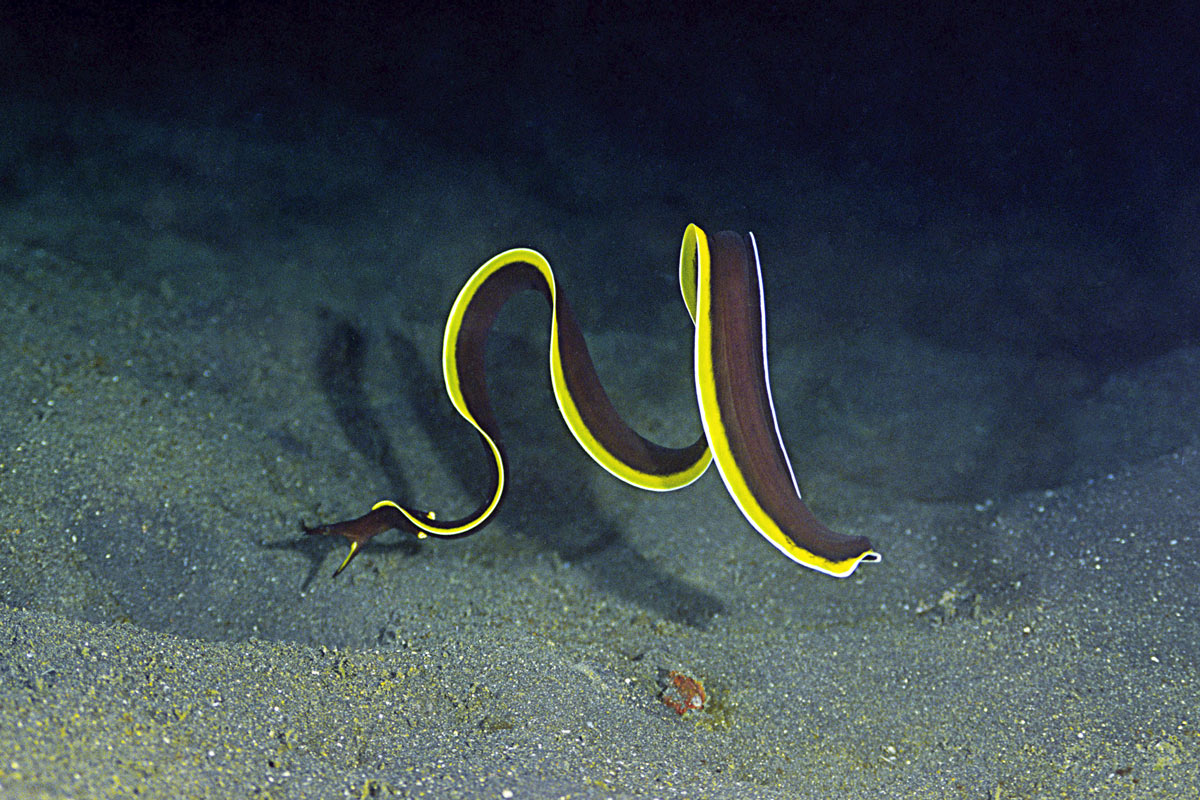 La Rhinomuraena quaesita è un pesce ermafrodita con il corpo a sezione nastriforme. La livrea giovanile è nera con bordature gialle, col passare del tempo i maschi assumono una colorazione blu elettrico con bocca e pinne di un giallo intenso; le femmine, invecchiando, diventano di colore giallo vivo. E’ un soggetto molto interessante da fotografare sia per la livrea molto colorata, che per la caratteristica morfologia del muso. Nel caso specifico si tratta di un esemplare giovanile, incontrato in acqua libera durante una immersione notturna. Un caso piuttosto fortunato, che si verifica raramente e che pone in evidenza la strana morfologia di questo pesce appartenente alla famiglia Muraenidae.