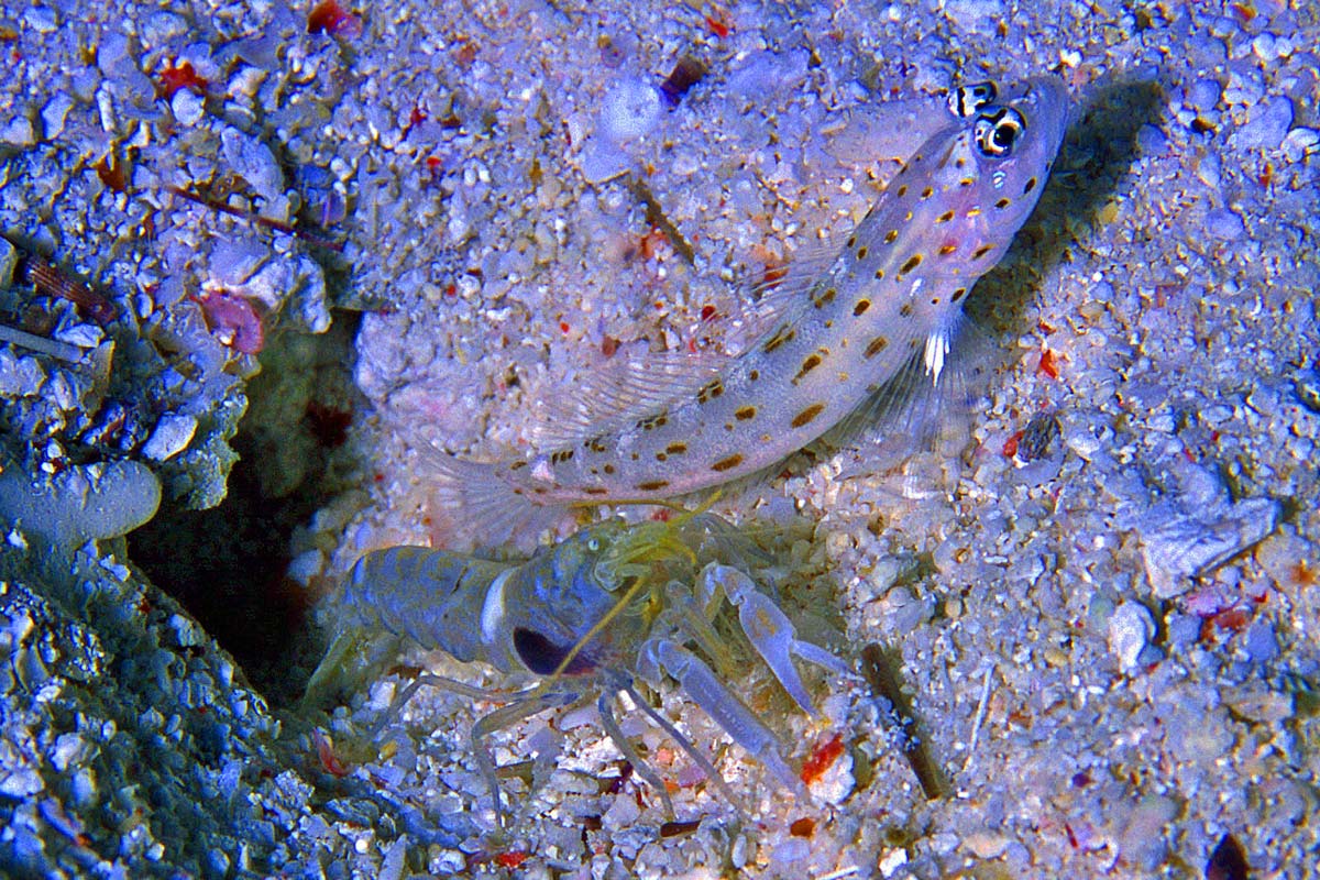 In mare i fenomeni di simbiosi sono molteplici e variegati. Uno dei più noti è quello tra gobidi e gamberi, dove il ghiozzo fa la guardia sull’uscio di casa e dà l’allarme in caso di pericolo; mentre i gamberi (che in genere sono due), si occupano delle faccende di casa. Eliminano la sabbia e i residui che ingombrano la tana e inoltre “ingegneri del mare” rinforzano con sassolini e pezzi di corallo l’ingresso e soprattutto la sua parte superiore, allo scopo di impedire crolli e frane. Anche in questo caso valgono le medesime regole dell’incontro precedente, se il gobide si sente in pericolo con movimenti a scatto avvisa i gamberi e tutto il “team” rientra immediatamente nella tana. Un consiglio: meglio avvicinarsi di lato e non frontalmente, avremo maggiori possibilità di realizzare qualche scatto interessante.
