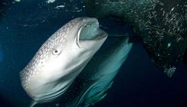 L’abbondante esca viva attira l’attenzione di qualcun altro, qualcuno che ama seguire le correnti oceaniche, trainate dagli alisei, e seguire i banchi di pesciolini minuti di cui si nutre. Lo squalo balena, gigante dalle lentiggini bianche, si trova a entrare nella baia e a nuotare, vicino alla superficie, attorno alle reti, forse chiedendosi perché quella palla di pesce appetitoso ora risulti irraggiungibile.