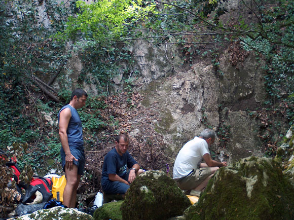 Martedì – Al mattino i compiti sono così suddivisi: Paolo e Emilio “bonificheranno” l’ingresso eliminando una pianta caduta, tagliandone rami e radici che ostacolano il passaggio; poi raddoppieranno le corde di tenuta delle scale; Jean Jacques, Lorenzo arrivato da Genova, ed io sistemeremo le attrezzature selezionando il materiale da portare alla sorgente. Il tempo che occorre è più lungo del previsto e quando raggiungiamo la sorgente alle 12.00 abbiamo ancora tutto il materiale da trasportare all’ingresso.