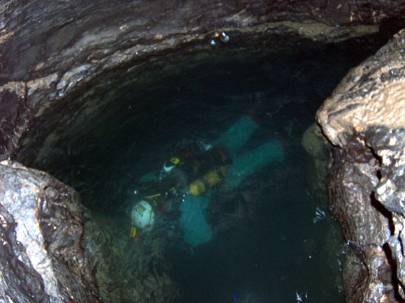 Mi sento impacciato nella grossa muta poichè devo scendere il pozzo con il circuito più 12kg di zavorra che mi servono per compensare i volumi d’aria che tiene l’interno di questa muta. Raggiunta l’acqua, mi infilo le pinne, mi aggancio i due grossi relè da 20lt, prendo il faro, lo svolgisagola di soccorso e dopo aver riscaldato il materiale filtrante, inizio la discesa. La visibilità è talmente peggiorata che non vedo a più di un metro di distanza; raggiungo il fondo del pozzo a -67m, stabilizzo a 1,2 la PpO2 ed entro nella galleria sub orizzontale che si mantiene per una ventina di metri alla profondità di –70m: eccomi al secondo pozzo che mi fa raggiungere rapidamente i –80m. La galleria parte ora sulla destra rispetto a quella precedente, la percorro per una ventina di metri e raggiungo i –90m a 152m di distanza; poco dopo un’altra curva secca a sinistra di 70°, una decina di metri ed eccomi nei pressi del terzo pozzo. Raggiungo lo svolgisagola a –101m lo impugno e scendo: avendolo percorso lo scorso anno, so che raggiungerò i –125m a 234m dall’ingresso. Sul fondo del pozzo trovo il vecchio filo tutto rotto e pericolosamente raggomitolato: cerco di fissarlo in qualche modo ma la poca visibilità non mi aiuta e decido di lasciarlo in un angolino; impiego quasi un minuto per cercare la galleria orizzontale, finalmente la trovo, fisso il filo su di un comodo ancoraggio sul fondo: appena entrato nella galleria, ho l’impressione che rispetto a sopra, la direzione cambi di 90°. Ora pinneggio in tutta tranquillità: in fondo a questo tratto di una ventina di metri, c’è una curva a sinistra; dai –127m risalgo di un paio di metri ed eccomi sul bordo del quarto pozzo. La visibilità è così scarsa che nemmeno con le potenti e penetranti torce HID che mi ha fornito Giòsub, riesco a vedere la piccola galleria da me osservata lo scorso anno che parte sulla sinistra poco prima del quarto pozzo. Metto un ancoraggio in cima, discesa veloce ed ulteriore ancoraggio sul fondo. A -138m a 248m di progressione eccomi sullo stesso punto da me raggiunto lo scorso anno: la voglia è tanta mi lascio tentare, inizio a pinneggiare in ambienti mai visti dall’uomo con un ritmo inferiore a quello che utilizzo nella parte meno profonda. Dopo una quindicina di metri e una curva secca sulla sinistra, la galleria accenna ad una risalita ma, in effetti, risale bruscamente solo dopo altri dieci metri: decido di fermarmi qui. Devo ripercorrere la galleria prima di iniziare a perdere quota; sono al venticinquesimo minuto quando mi stacco dai –138m: da qui inizia la lenta risalita che mi riporterà alle quote deco più alte.