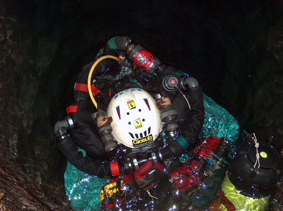 Jean Jacques si dedica alla topografia del pozzo iniziale, anche se la visibilità sta diminuendo a causa delle immersioni continuative: non essendoci un ricambio d’acqua, l’argilla presente sulle pareti rimane in sospensione.