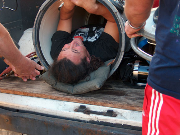 Mi cambio, prendo la sacca con i sottomuta per portarli ad asciugare e inizio il ripido sentiero che porta al furgone; sono appena arrivato che inizio a sentire un dolorino al ginocchio; senza perdere tempo mi infilo nella nostra camera di decompressione portatile, dove Jean Jacques mi ricomprime: a –1m il dolore scompare, tuttavia scendo a –6m per 30’ cosicché quando esco tutto è passato.