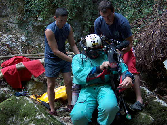 Corro all’agriturismo e preparo un’altra bombola; raggiunta nuovamente la grotta assemblo la bombola, metto in ordine le piccole cose da portare sul bordo dell’acqua, tolgo dal sacco i vestiti da indossare e mi accorgo che manca il cavetto di raccordo del giubbetto elettrico. Stavolta è Massimo che va nuovamente all’agriturismo a prenderlo mentre io inizio a cambiarmi. Il tutto ci costa un’altra mezzora.