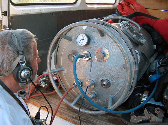 Mi cambio, prendo la sacca con i sottomuta per portarli ad asciugare e inizio il ripido sentiero che porta al furgone; sono appena arrivato che inizio a sentire un dolorino al ginocchio; senza perdere tempo mi infilo nella nostra camera di decompressione portatile, dove Jean Jacques mi ricomprime: a –1m il dolore scompare, tuttavia scendo a –6m per 30’ cosicché quando esco tutto è passato.