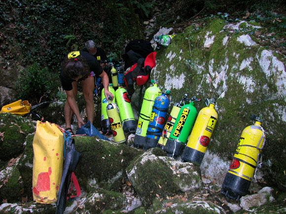 Corro all’agriturismo e preparo un’altra bombola; raggiunta nuovamente la grotta assemblo la bombola, metto in ordine le piccole cose da portare sul bordo dell’acqua, tolgo dal sacco i vestiti da indossare e mi accorgo che manca il cavetto di raccordo del giubbetto elettrico. Stavolta è Massimo che va nuovamente all’agriturismo a prenderlo mentre io inizio a cambiarmi. Il tutto ci costa un’altra mezzora.