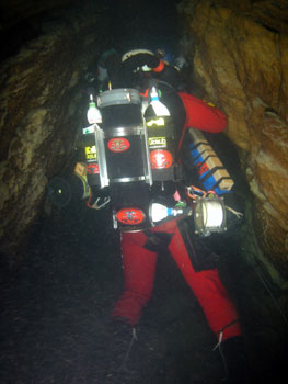 Nel pozzo, mentre risalgo, recupero anche le bombole da decompressione posizionate a –50m ed a –36m, vengo raggiunto come previsto da Josè dopo 185’ quando mi trovo a –25m. Mi fissa le cavigliere, mi passa la batteria e la borraccia mentre io gli passo piano piano per evitare che qualche cosa cada sul fondo del pozzo una parte del materiale. Il sollievo che da il caldo del giubbetto elettrico fa sempre piacere, il tè che dopo averlo assaggiato è sempre bollente lo lascio raffreddare; con il contatto dell’acqua e in un paio di minuti sarà perfetto. Non appena finisco di bere rivedo Josè questa volta con la lavagnetta, sulla quale scrivo il risultato totale dell’esplorazione: 95m di nuove scoperte per cui in totale la grotta misura 343m (la parte allagata), la profondità alla fine dell’esplorazione è di 120m, mentre la profondità massima rimane di 138m.