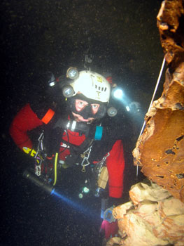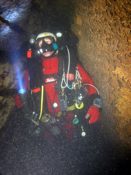 Mi sento impacciato nella grossa muta poichè devo scendere il pozzo con il circuito più 12kg di zavorra che mi servono per compensare i volumi d’aria che tiene l’interno di questa muta. Raggiunta l’acqua, mi infilo le pinne, mi aggancio i due grossi relè da 20lt, prendo il faro, lo svolgisagola di soccorso e dopo aver riscaldato il materiale filtrante, inizio la discesa. La visibilità è talmente peggiorata che non vedo a più di un metro di distanza; raggiungo il fondo del pozzo a -67m, stabilizzo a 1,2 la PpO2 ed entro nella galleria sub orizzontale che si mantiene per una ventina di metri alla profondità di –70m: eccomi al secondo pozzo che mi fa raggiungere rapidamente i –80m. La galleria parte ora sulla destra rispetto a quella precedente, la percorro per una ventina di metri e raggiungo i –90m a 152m di distanza; poco dopo un’altra curva secca a sinistra di 70°, una decina di metri ed eccomi nei pressi del terzo pozzo. Raggiungo lo svolgisagola a –101m lo impugno e scendo: avendolo percorso lo scorso anno, so che raggiungerò i –125m a 234m dall’ingresso. Sul fondo del pozzo trovo il vecchio filo tutto rotto e pericolosamente raggomitolato: cerco di fissarlo in qualche modo ma la poca visibilità non mi aiuta e decido di lasciarlo in un angolino; impiego quasi un minuto per cercare la galleria orizzontale, finalmente la trovo, fisso il filo su di un comodo ancoraggio sul fondo: appena entrato nella galleria, ho l’impressione che rispetto a sopra, la direzione cambi di 90°. Ora pinneggio in tutta tranquillità: in fondo a questo tratto di una ventina di metri, c’è una curva a sinistra; dai –127m risalgo di un paio di metri ed eccomi sul bordo del quarto pozzo. La visibilità è così scarsa che nemmeno con le potenti e penetranti torce HID che mi ha fornito Giòsub, riesco a vedere la piccola galleria da me osservata lo scorso anno che parte sulla sinistra poco prima del quarto pozzo. Metto un ancoraggio in cima, discesa veloce ed ulteriore ancoraggio sul fondo. A -138m a 248m di progressione eccomi sullo stesso punto da me raggiunto lo scorso anno: la voglia è tanta mi lascio tentare, inizio a pinneggiare in ambienti mai visti dall’uomo con un ritmo inferiore a quello che utilizzo nella parte meno profonda. Dopo una quindicina di metri e una curva secca sulla sinistra, la galleria accenna ad una risalita ma, in effetti, risale bruscamente solo dopo altri dieci metri: decido di fermarmi qui. Devo ripercorrere la galleria prima di iniziare a perdere quota; sono al venticinquesimo minuto quando mi stacco dai –138m: da qui inizia la lenta risalita che mi riporterà alle quote deco più alte.