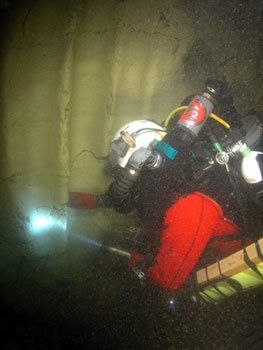 Mario si immerge per andare a portare una bombola di soccorso a –36m e per togliere i vecchi fili dal pozzo iniziale.